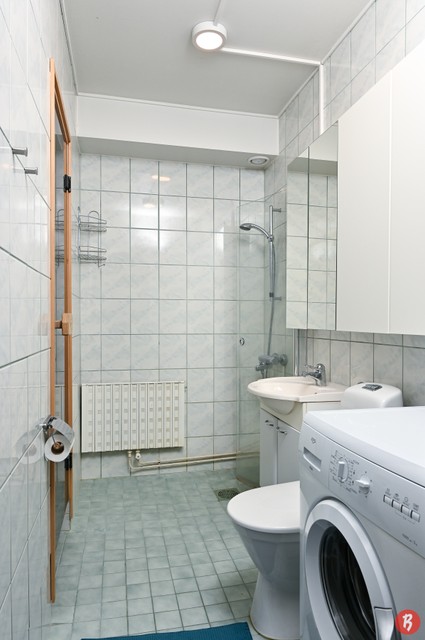 - WC-istuin, suihku, pesukoneliitäntä, peilikaappi, pesuallas, allaskaappi, ja bidee-suihku