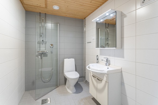 - Suihkuseinä, lattialämmitys, suihku, pesukoneliitäntä, wc-istuin, ja peilikaappi