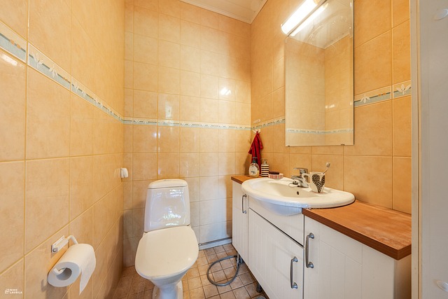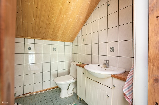 - Erillinen wc alakerrassa: käsienpesuallas, allaskaappi, peili wc-istuin. Lattia ja seinät laattaa.