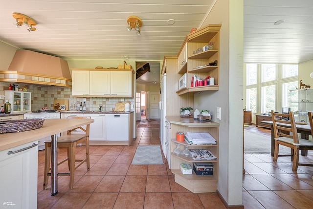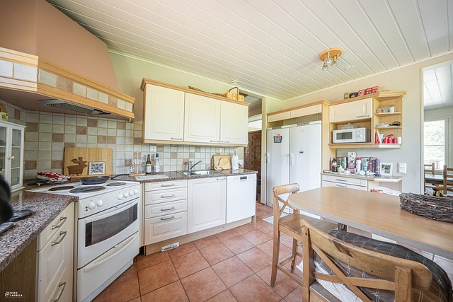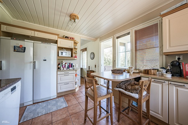 - Kaapisto: Kermanväriset kaapinovet, välitilalaatoitus, kivi- sekä laminaattitasot. Kodinkoneet: Jääkaappi, pakastin, astianpesukone, sähköliesi, liesikupu. Lattia laattaa ja seinät maalattu.