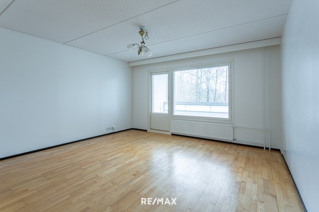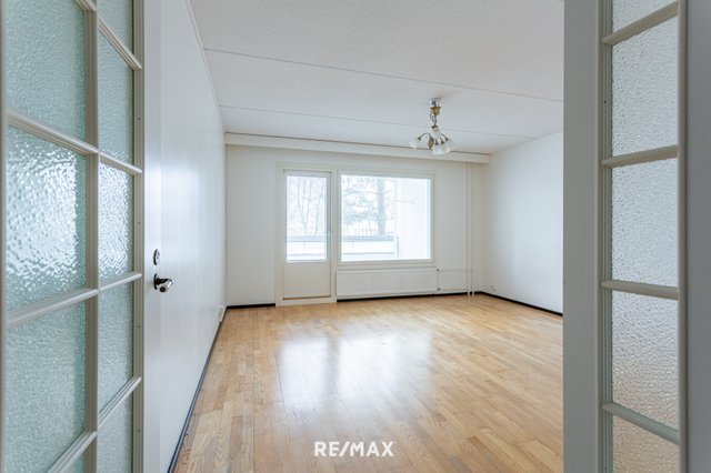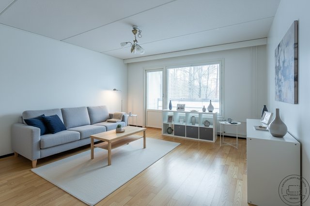 - Olohuone on vaalea, avara tila josta kulku lasitetulle parvekkeelle. Lattiat laminaattia ja seinät valkoiseksi maalattu. Olohuoneessa myös ovet joita voi hyödyntää vieraiden saapuessa yökylään tai sijoitusasunnoksi asuntoa suunnittelevan kolmanneksi makuuhuoneeksi.