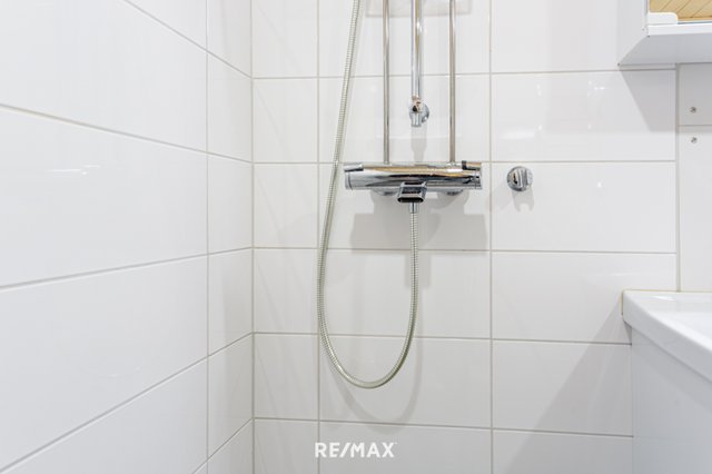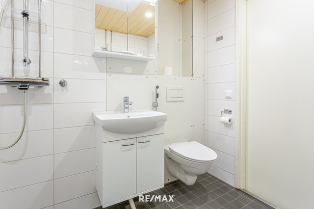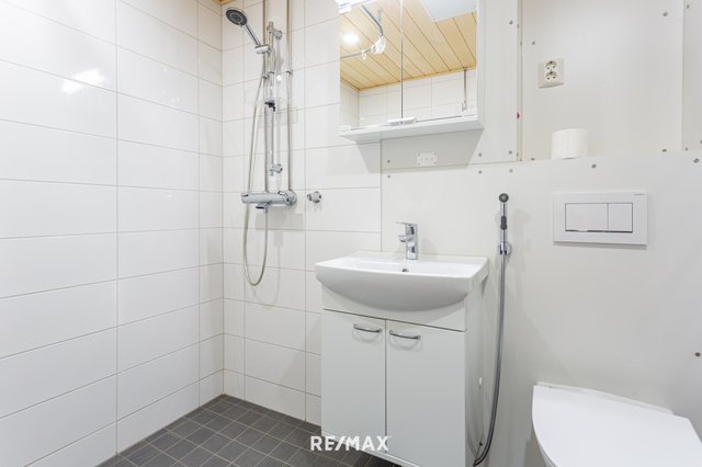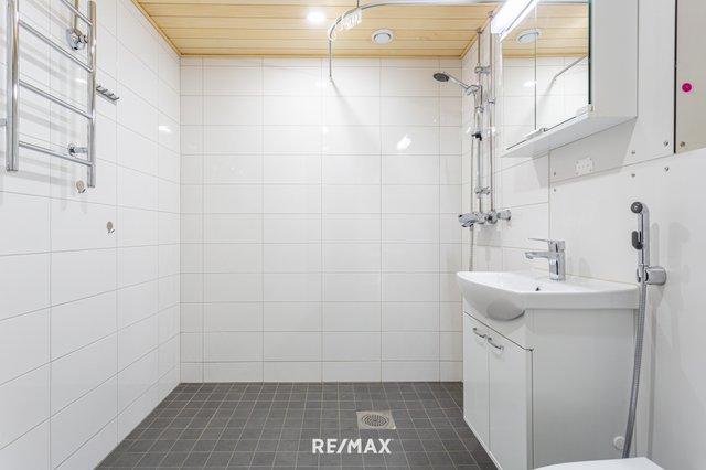 - 2021-2022 kylpyhuoneet on uusittu LVI-saneerauksen yhteydessä. Kylpyhuone on tilava, nykyaikaisen vaalea. Wc-istuin, peilikaappi, allaskaappi sekä suihku. Kylpyhuoneessa on myös pesukoneliitäntä.