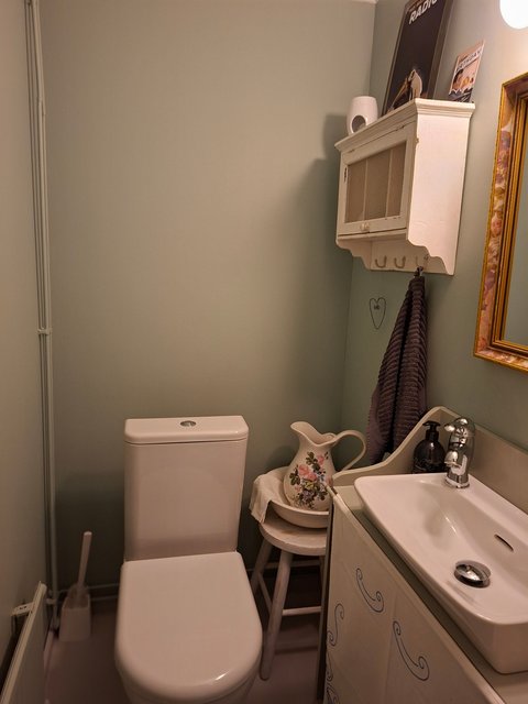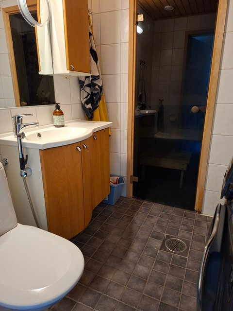 - Suihku, peilikaappi, pesuallas, pesukoneliitäntä, allaskaappi, wc-istuin, bidee-suihku, ja lattialämmitys
