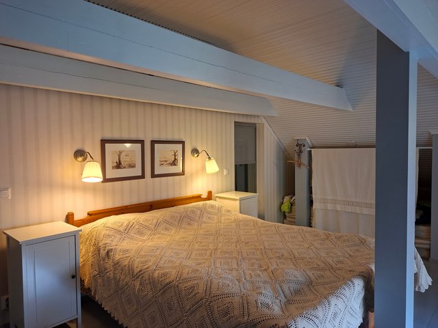 Omassa saunassa saa rentouttavat löylyt. Kaksi makuuhuonetta tarjoavat rauhalliset tilat lepoon, ja säilytystilaa on runsaasti vaatehuoneessa ja kaapeissa. Lisäksi ullakolle on rakennettu ihana iso tila vaikka makuupaikaksi.