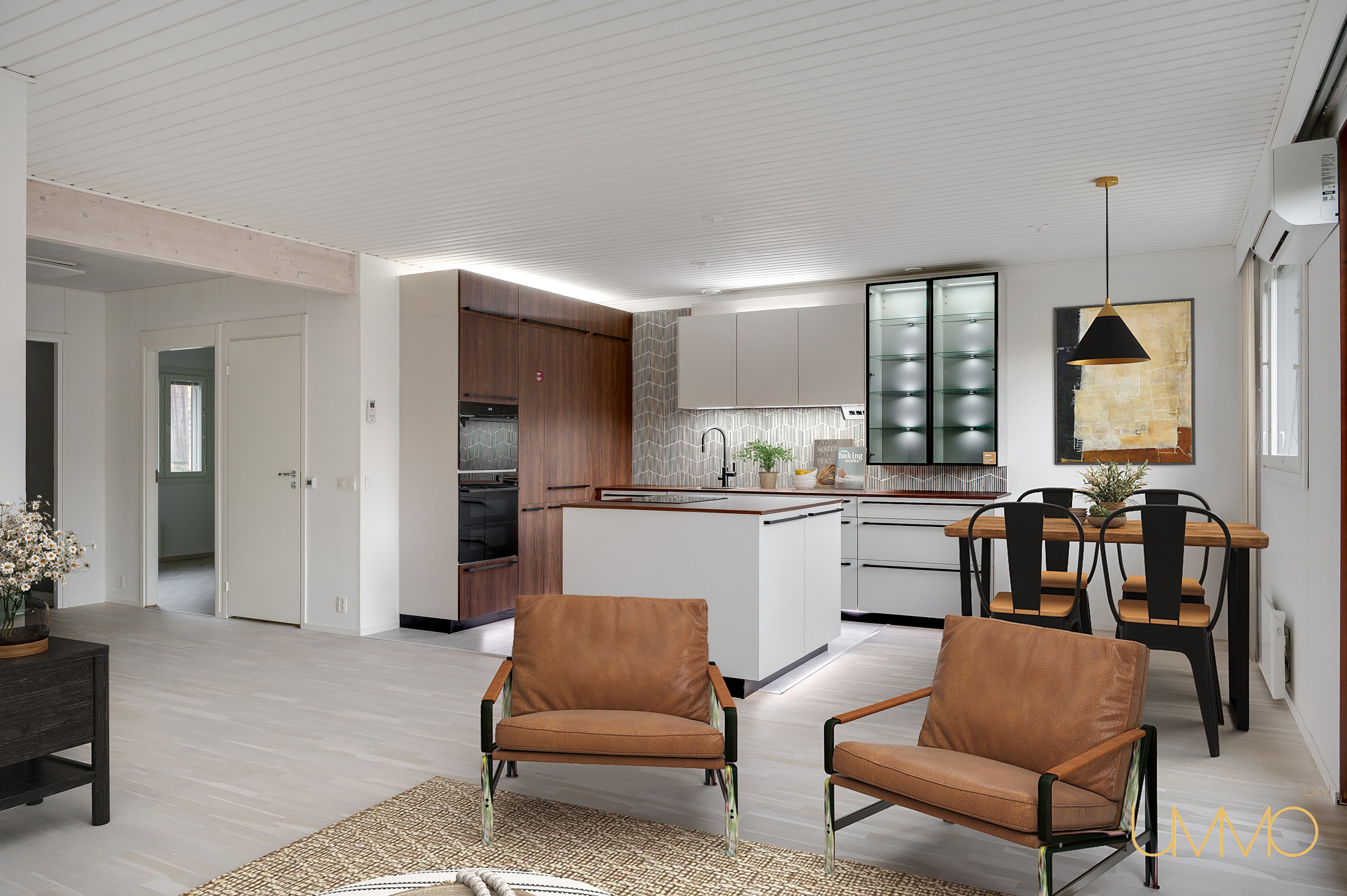 Keittiö on remontoitu laadukkaalla Noblessan keittiöllä, ja siellä on runsaasti kaappi- ja laskutilaa. Moderni kylpyhuone saunoineen on juuri uusittu, ja käsityönä tehdyt saunan lauteet luovat tunnelmallisen ilmapiirin. Kaksi makuuhuonetta tarjoavat tilaa perheelle tai työhuoneelle. Molemmista makuuhuoneista löytyy hyvin säilytystilaa, toisessa on jopa vaatehuone. Olohuoneen käsitelty parkettilattia tuo lämpöä sisustukseen.