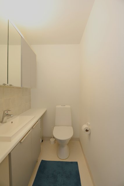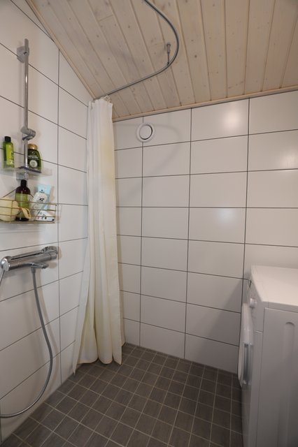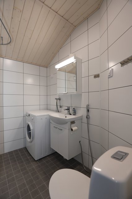 - WC-istuin, suihku, suihkuseinä, pesukoneliitäntä, peilikaappi, pesuallas, bidee-suihku, allaskaappi, ja lattialämmitys