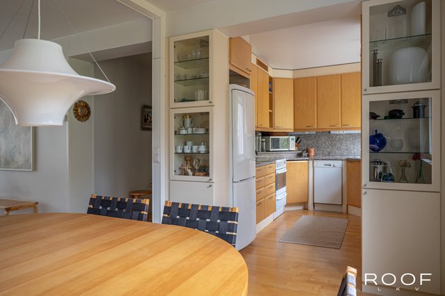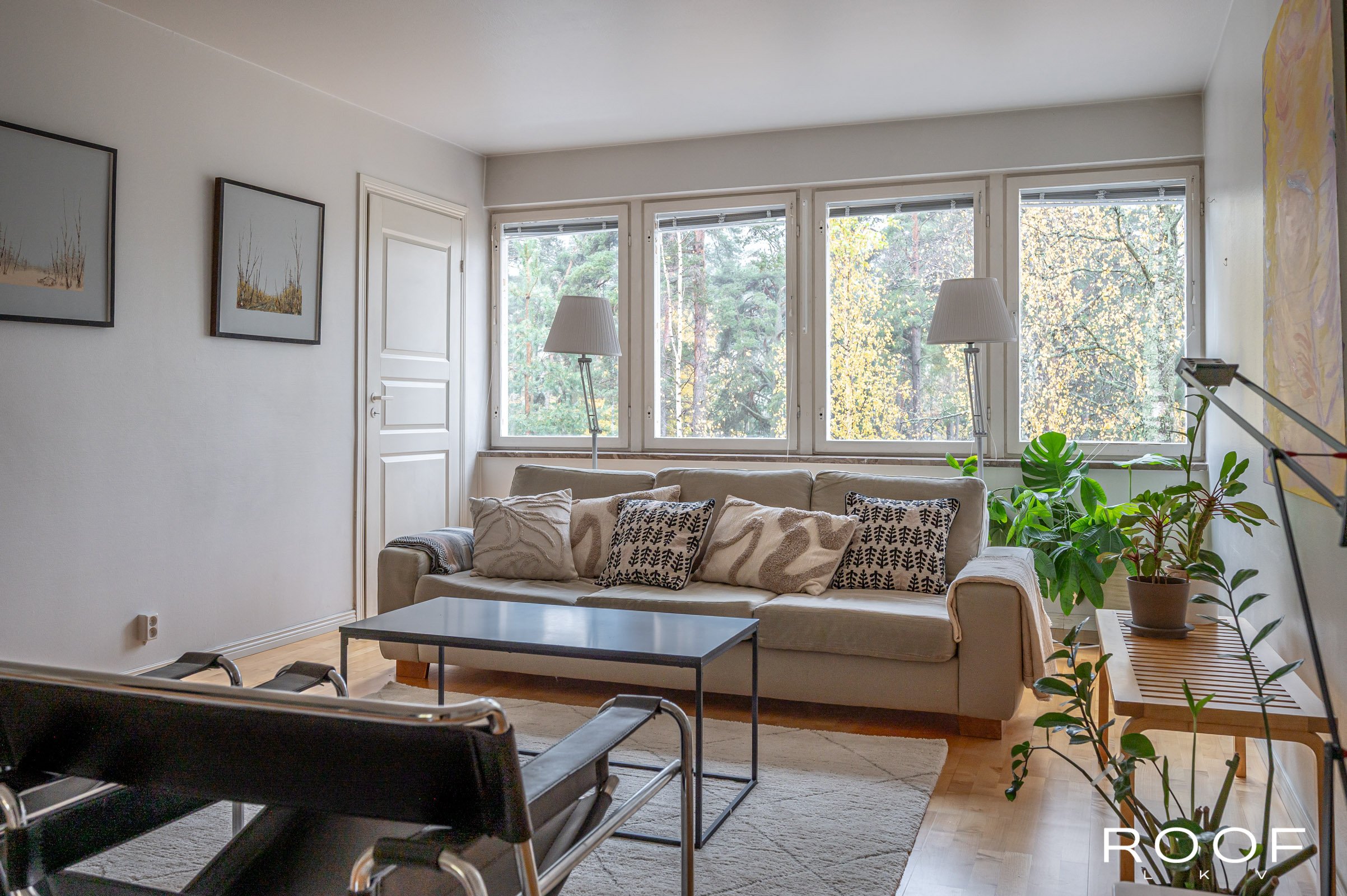 Asunnon sydän on yli 35 m²:n yhtenäinen olohuone-ruokailutila, jota kehystävät olohuoneen puolella nauhaikkunat – tyypillinen piirre Tapiolan varhaiselle arkkitehtuurille. Ikkunoista tulviva luonnonvalo korostaa tilan avaruutta ja luo sisätiloihin lempeän rytmin vuodenaikojen mukaan. Ruokailutilaan avautuvassa U-mallisessa keittiössä on kokopuiset ovet ja graniittitasot. Tilavat makuuhuoneet sijoittuvat asunnon toiseen päätyyn tarjoten runsaasti säilytystilaa ja arjen rauhaa.