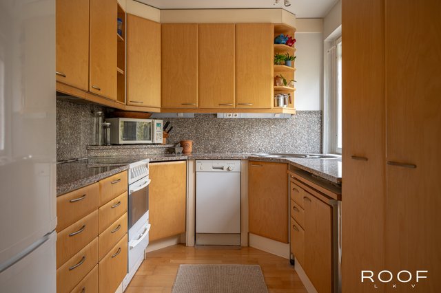 - Ruokailutilaan avautuva U-mallinen keittiö, jossa massiivipuuta olevat kaapistojen ovisarjat ja helppohoitoinen graniittitaso.