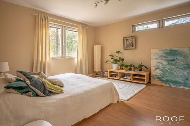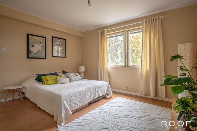 - Kaksi erittäin tilavaa makuuhuonetta, joissa molemmissa nauhaikkunat sekä runsaasti säilytystilaa esim. vaatesäilytykselle. Lattiat parkettia ja laminaattia, seinät tapetoitu ja maalattu.