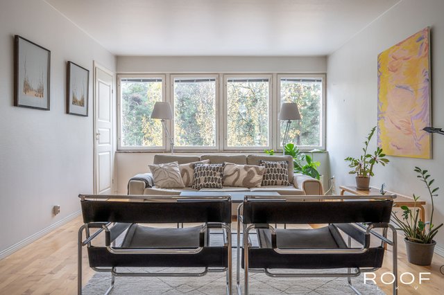 Tervetuloa Menninkäisentie 5:een – kotiin, jossa yhdistyvät puutarhakaupungin ikoninen arkkitehtuuri ja vehreä elinympäristö. Tämä 89,5 m²:n suuruinen, alun perin neliöksi suunniteltu, nyt kolmioksi avarrettu läpitalon huoneisto edustaa 1950-luvun suomalaisen asuntorakentamisen kultakautta.