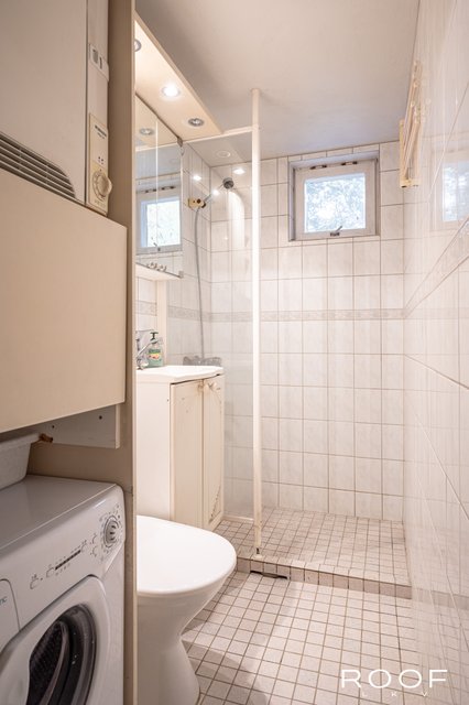 - WC-istuin, suihku, suihkuseinä, allaskaappi, peilikaappi, ja pesukoneliitäntä