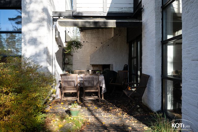 Olohuoneen korkea katto luo hulppean tilan tunnun ja persoonallisista ruutuikkunoista valo pääsee tanssimaan sisälle. Olohuoneessa on myös takka talvella tunnelmaa tuomaan ja kesällä olohuoneesta pääsee kulkemaan omalle suojaisalle pihalle, jossa sijaitsee myös kätevä ulkotakka, minkä äärellä kestitsee mielellään vieraita.