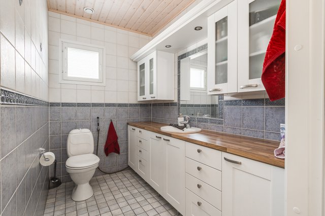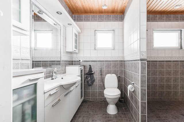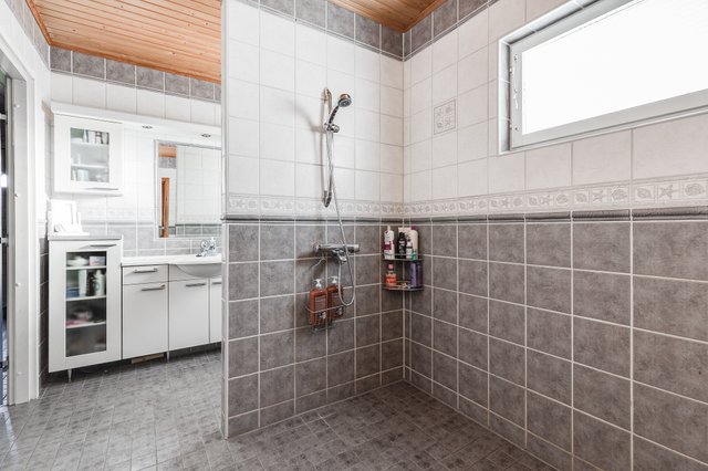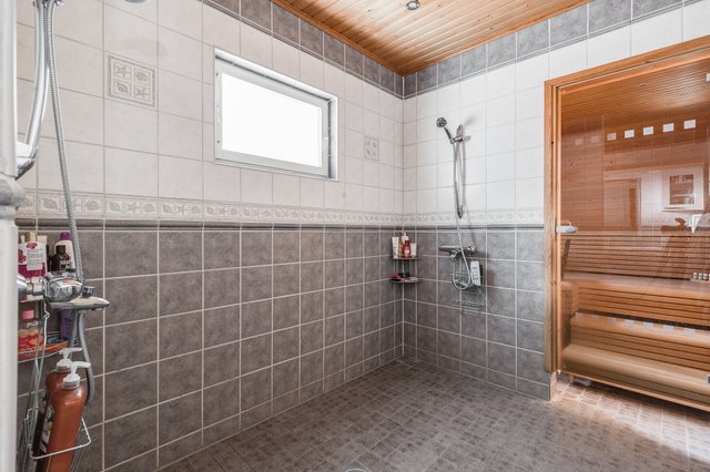 - Kylpyhuone/wc: wc-istuin, bidesuihku, allas, kaapistot, 2 suihkua, ikkunat, lattialämmitys (vesikiertoinen).