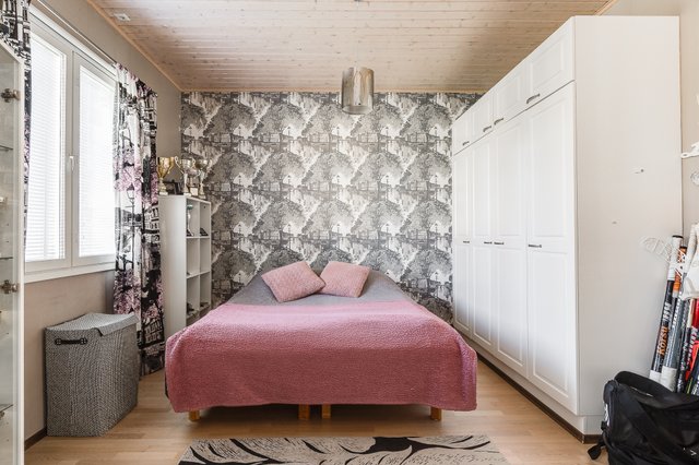- Kylpyhuone/wc, kodinhoitohuone ja wc laattaa. Sauna puupanelia. Muut tilat tapettia/maalattua lasikuitutapettia.