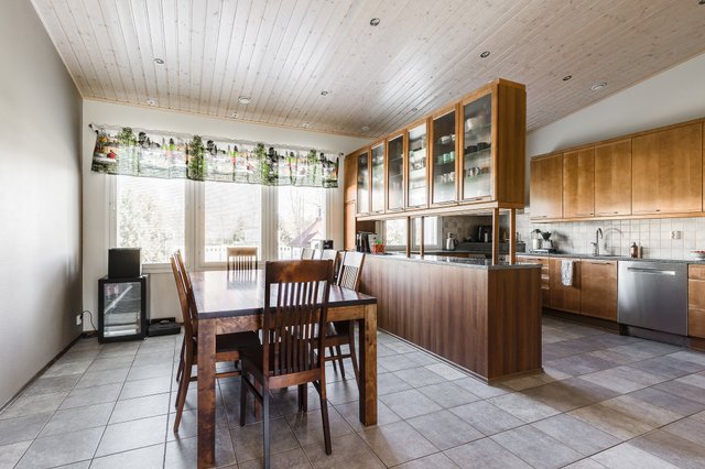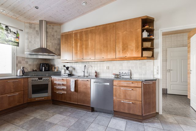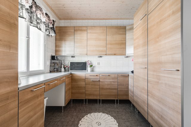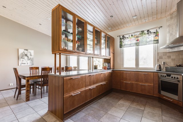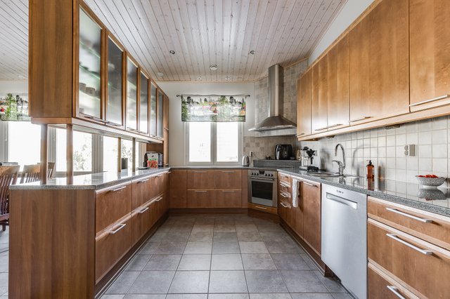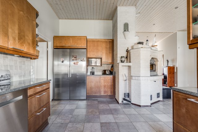 - Petra-keittiön kaapistot (petsatut täyskoivu ovet), laadukkaat rosteriset kodinkoneet; jääviileäkaappi (uusittu 2014), pakastinkaappi (uusittu 2014), astianpesukone (uusittu 2016), integroitu keraaminen liesi, liesituuletin (uusittu 2017), kivitasot. Laadukas, toimiva ja tilava keittiö/ruokailutila.