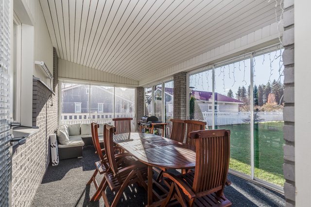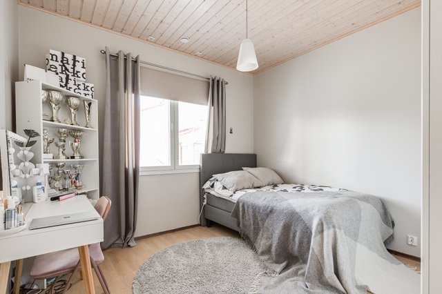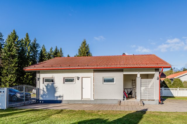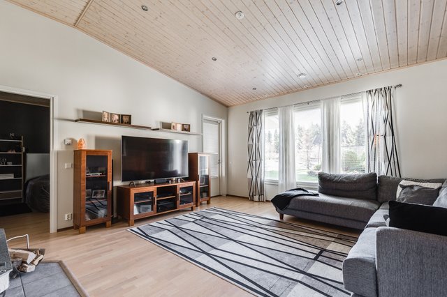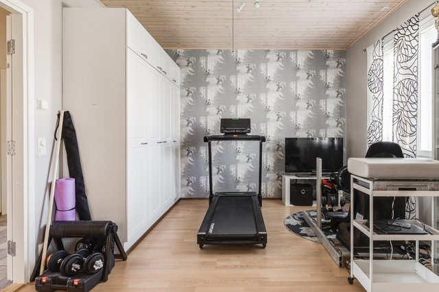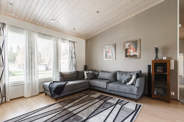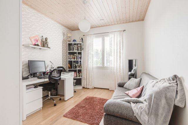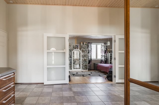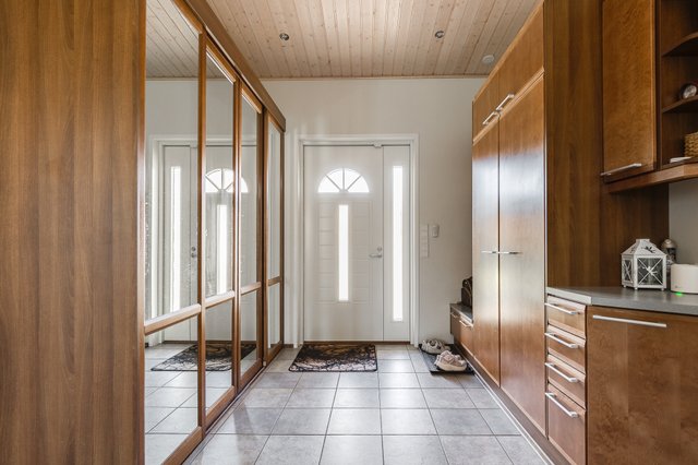- Eteinen, käytävä, keittiö/ruokailutila, kodinhoitohuone, erillinen wc, kylpyhuone/wc ja sauna laattaa. Muut tilat valkotammiparkettia.