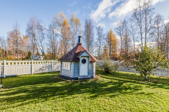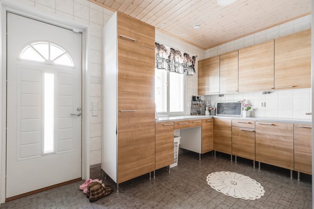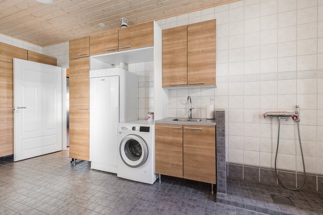 - Iso noin 18 m2:n kodinhoitohuone, jossa runsaasti kaapistoja, allas, kurapiste, pesukoneliitäntä, kuivauskaappi, ovi takapihalle.