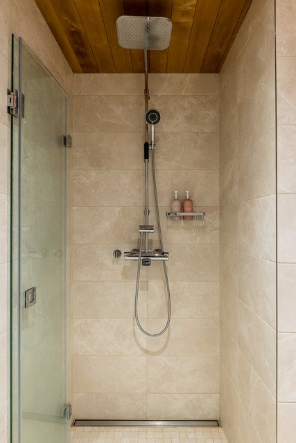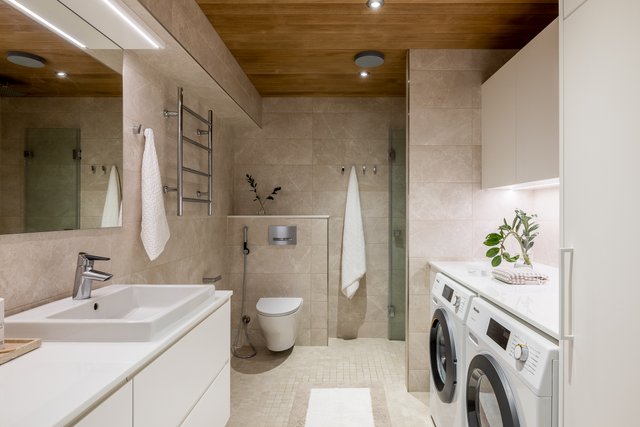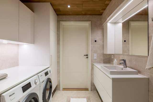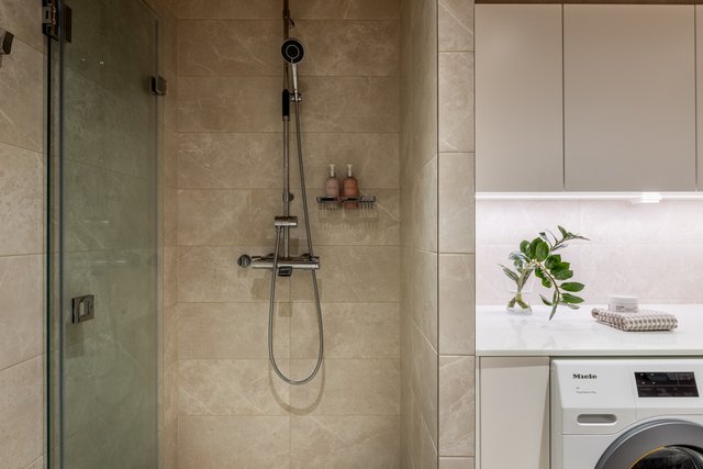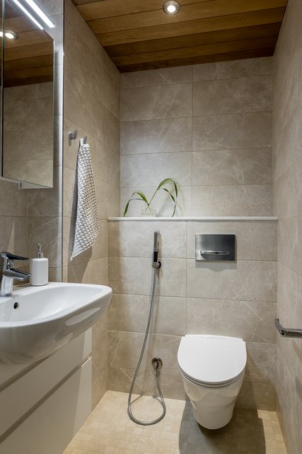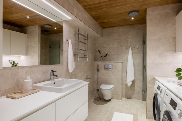 - WC-istuin, suihku, pesukoneliitäntä, lattialämmitys, bidee-suihku, allaskaappi, peilikaappi, peili, ja pyyhekuivain