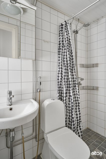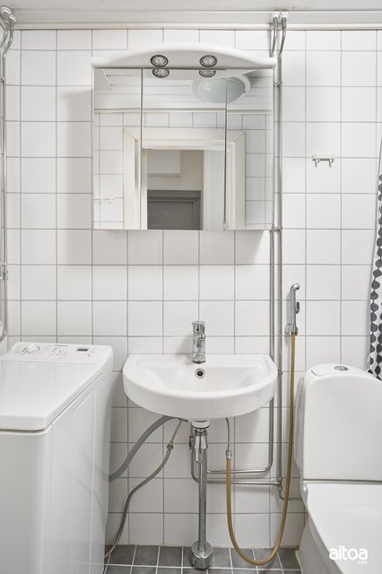 - WC-istuin, suihku, pesukoneliitäntä, peilikaappi, pesuallas, ja bidee-suihku