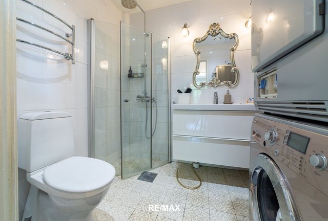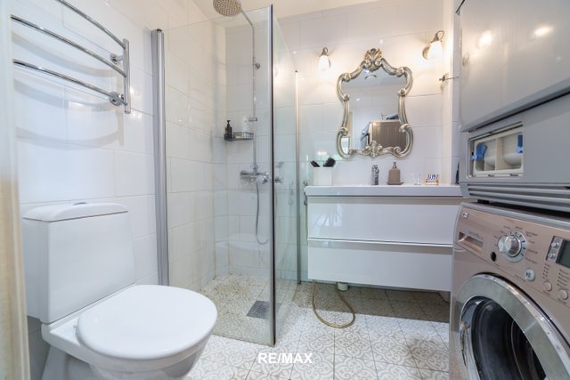 - WC-istuin, suihku, 2 taitettavaa suihkuseinää ja pyyhepatteri, pesuallas, allaskaappi, peili, ja lattialämmitys