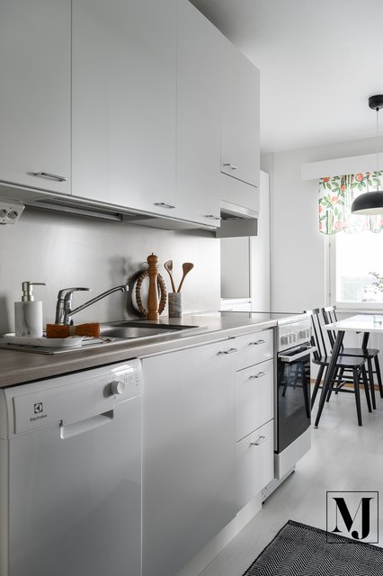 - 2019 uusittu Charmia-keittiö, tyylikäs vaalea keittiö jossa paikka ruokailupöydälle.