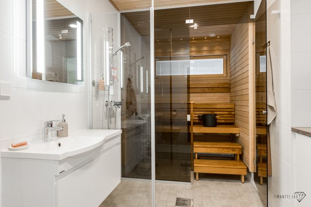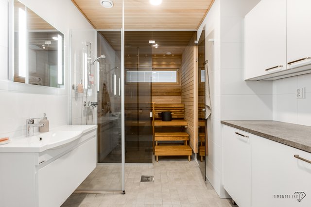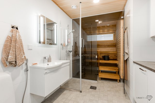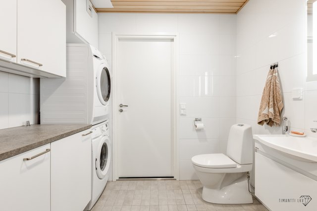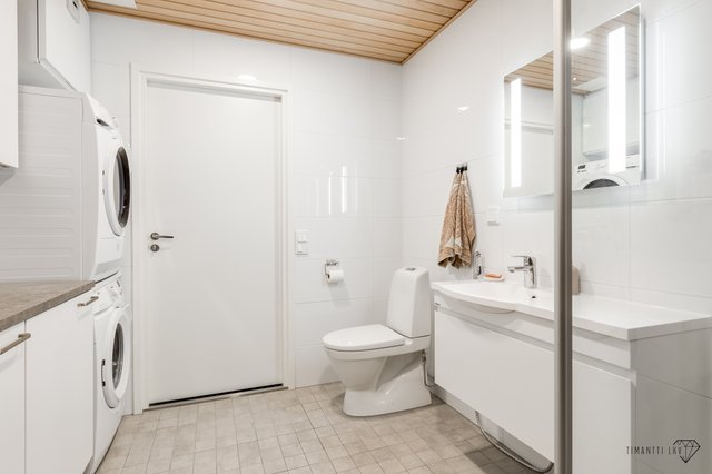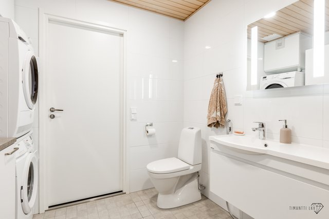 - Ajattomin laattavalinnoin toteutettu reilun kokoinen pesutila, jonka yhteydessä myös tilaa hyvin pyykkihuollolle. Tästä tilasta löytyy kaikki tarpeellinen. Siistissä kunnossa olevien pesutilojen yhteydessä myös tunnelmallinen sauna.