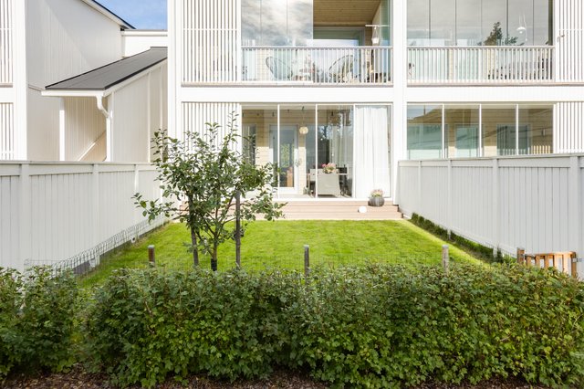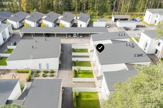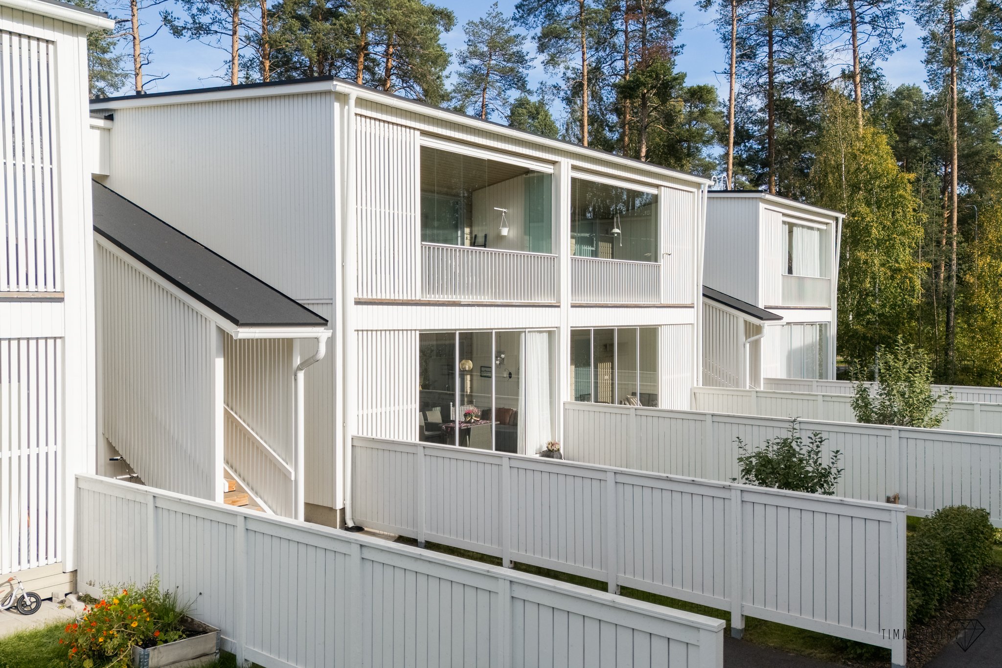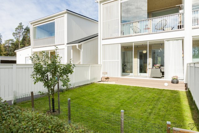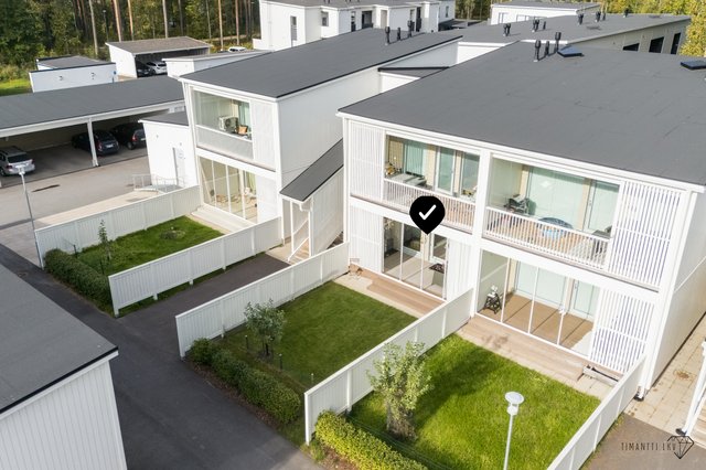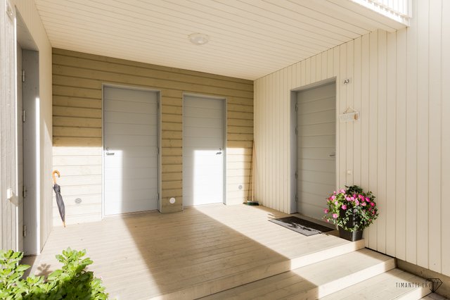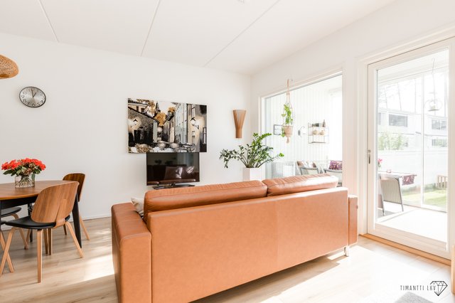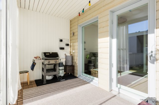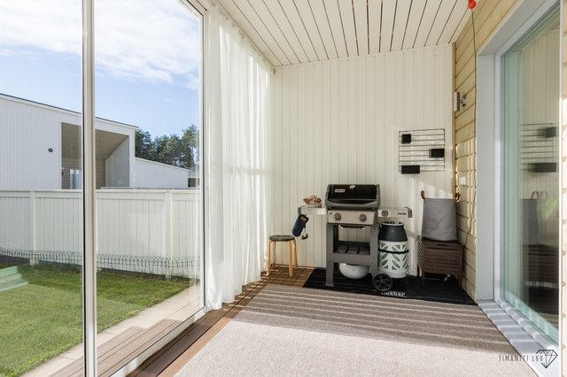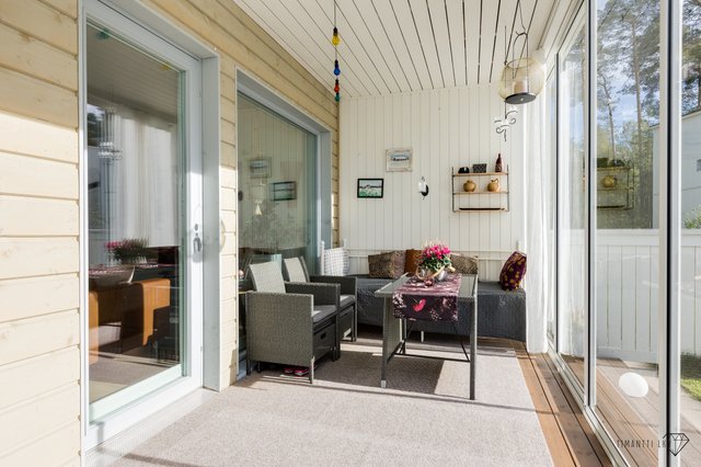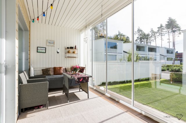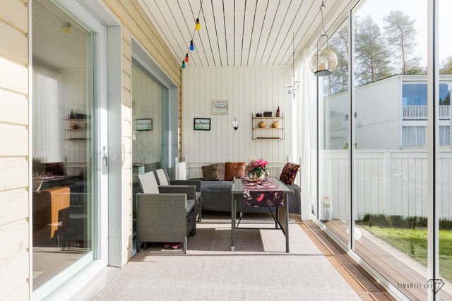 - Koko asunnon levyinen lasitettu terassi, joka tuo lisäneliöitä asumiseen. Terassin kautta kulku myös kodin takapihalle.