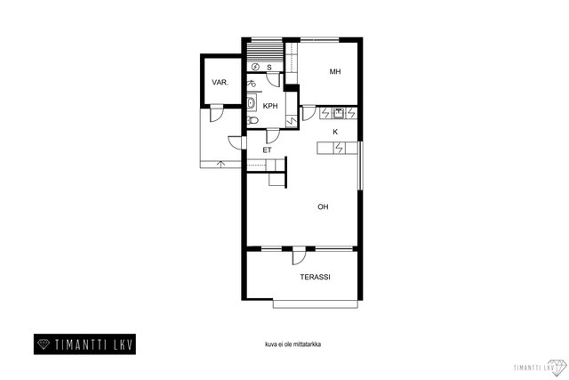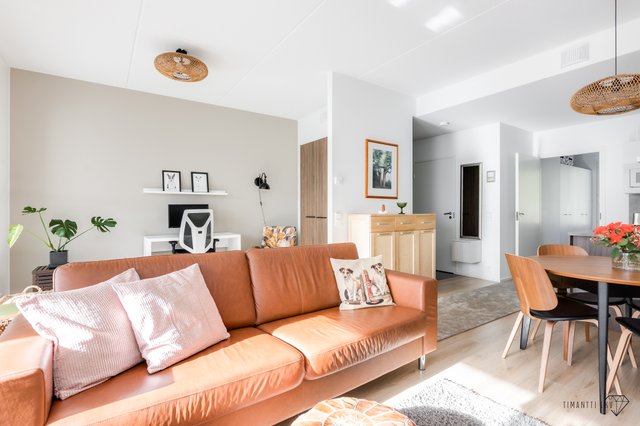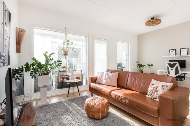 Asunnossa on avara ja valoisa olohuone, josta on käynti koko asunnon levyiselle lasitetulle terassille. Terassi tuo mukavasti lisätilaa ja avautuu suojaisalle takapihalle. Kodin olohuoneen voi helposti muokata omiin tarpeisiin sopivaksi, esimerkiksi lisäämällä toisen makuuhuoneen kevyellä väliseinällä muuttaen asunnon kolmioksi.