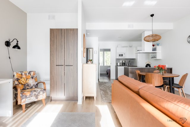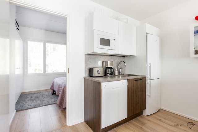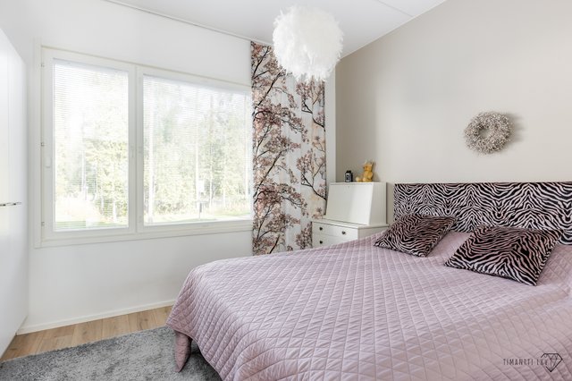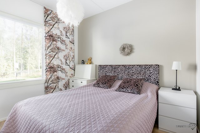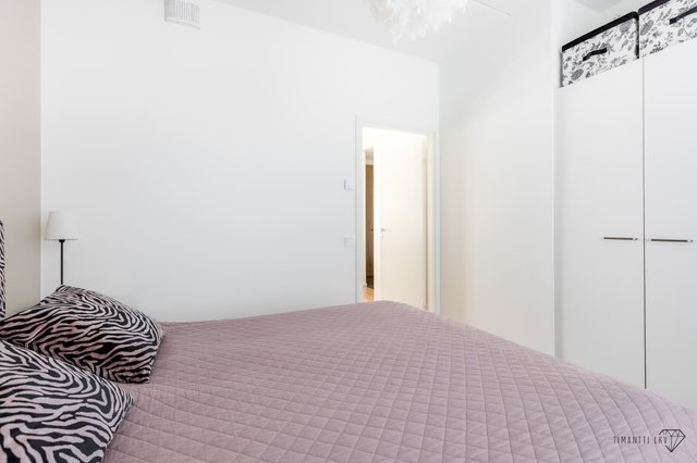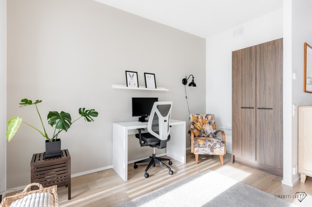 - Kodissa on tällä hetkellä yksi erillinen makuuhuone omassa rauhassa, jossa on runsaasti säilytystilaa kiintokaapistojen ansiosta. Asunnossa on myös mahdollisuus toiseen makuuhuoneeseen, jos tekee nykyiseen olohuoneeseen väliseinän.