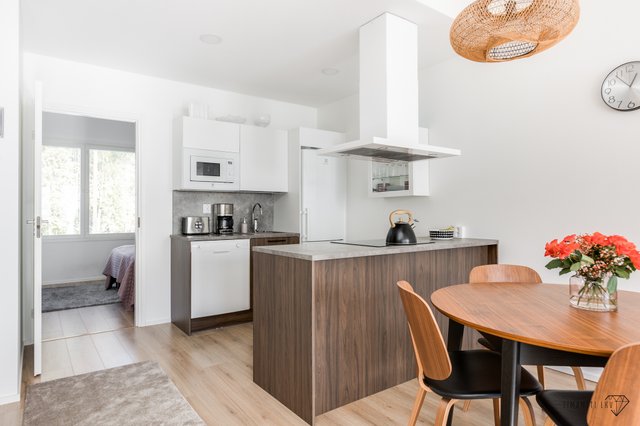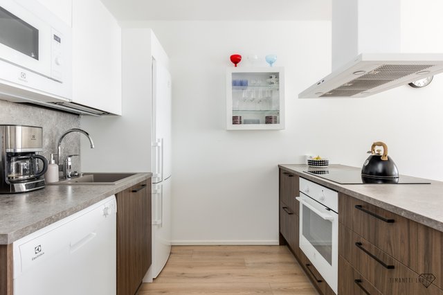 Puustellin kaunis keittiö kokonaisuus on tyylikäs ja käytännöllinen, ja se on erotettu olohuoneesta upealla saarekkeella. Keittiön varusteluun kuuluu kaikki tarpeellinen, kuten induktioliesi ja modernit kodinkoneet.