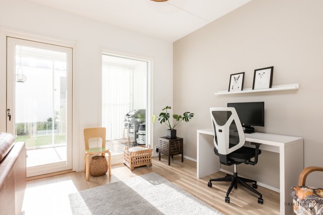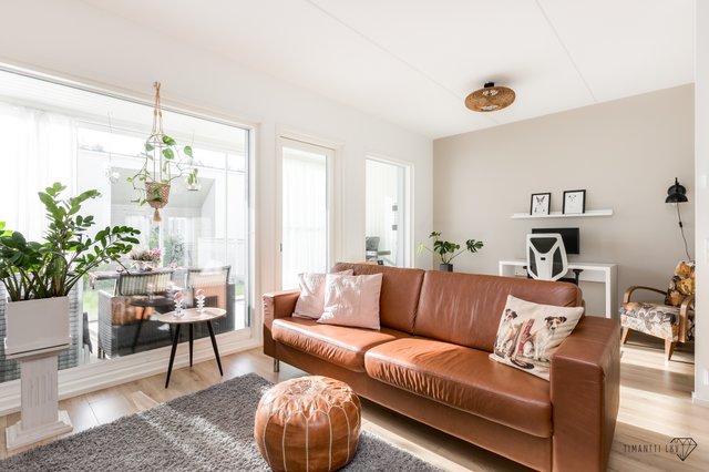 - Avara ja valoisa olohuone, jonka kautta kulku kodin lasitetulle terassille. Olohuone on tällä hetkellä iso avonainen tila, jonka käyttötarkoitukset ovat moninaiset. Halutessaan tilan voi jakaa olohuoneeseen sekä esimerkiksi työtilaksi. Mahdollisuus myös tehdä toinen makuuhuone kevyellä väliseinällä tai esimerkiksi lasiseinällä.