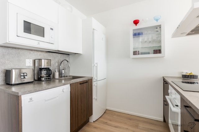 - Jääkaappipakastin, astianpesukone, keittiösaareke, liesituuletin, mikroaaltouuni, uuni, ja liesi