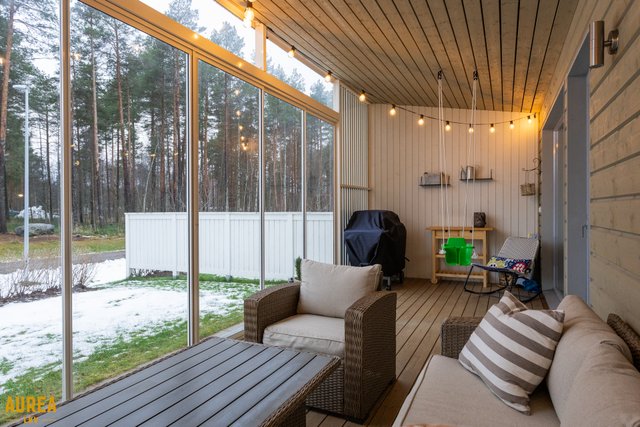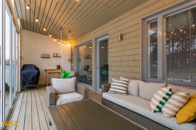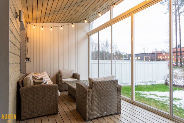 Olohuoneesta avautuu kulku huoneiston levyiselle lasitetulle terassille ja omalle takapihalle. Terassi tarjoaa merkittävästi lisää käyttötilaa keväästä pitkälle syksyyn ja toimii loistavana jatkeena sisätiloille.