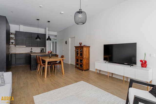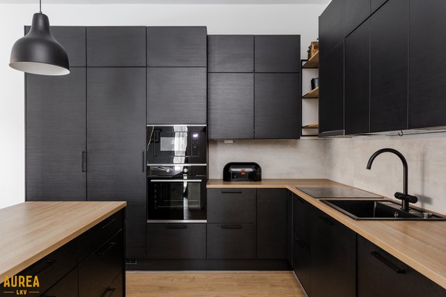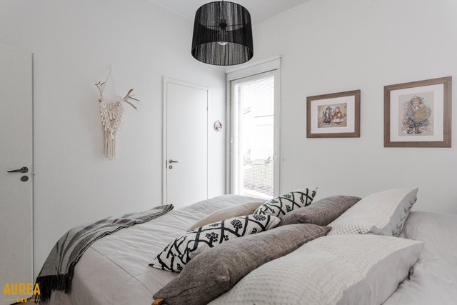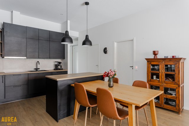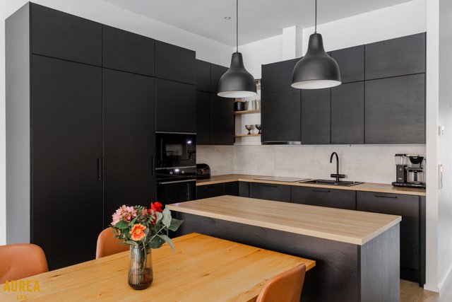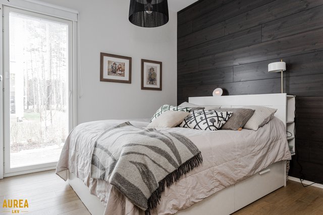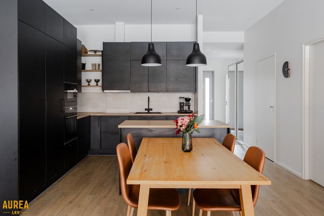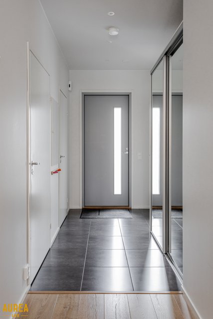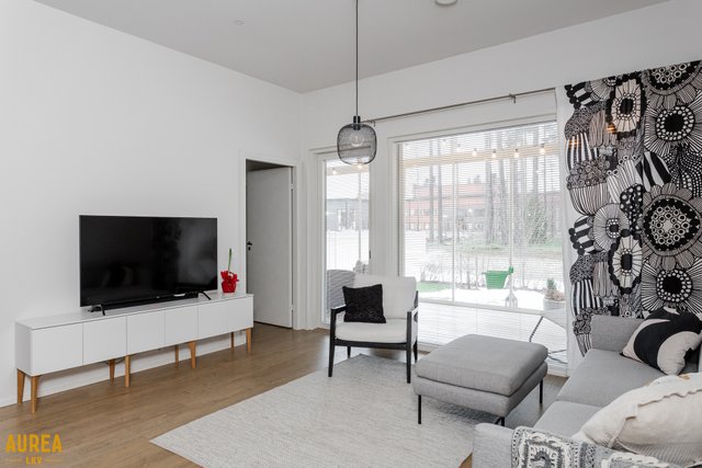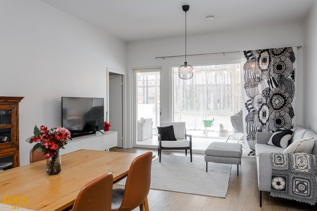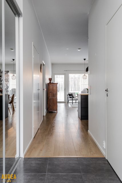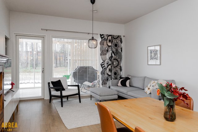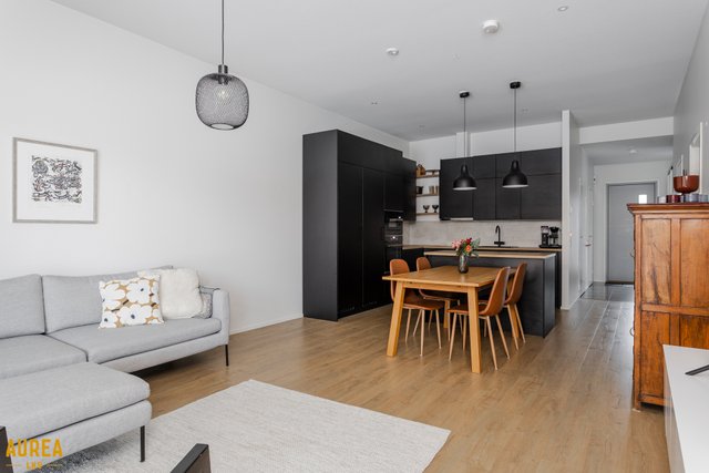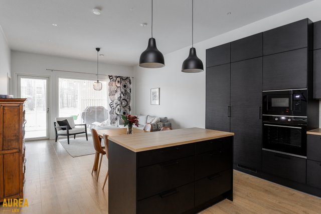 Tämä päätyasunto hurmaa erityisesti erinomaisella ja toimivalla pohjaratkaisullaan. Kodin sydän on näyttävä keittiön ja olohuoneen avoin kokonaisuus, jossa tilan tuntu ja valo pääsevät oikeuksiinsa. Puustellin tyylikäs musta keittiö on moderni ja ajaton, ja saareke toimii luontevana tilanjakajana sekä arjen kokoontumispaikkana.