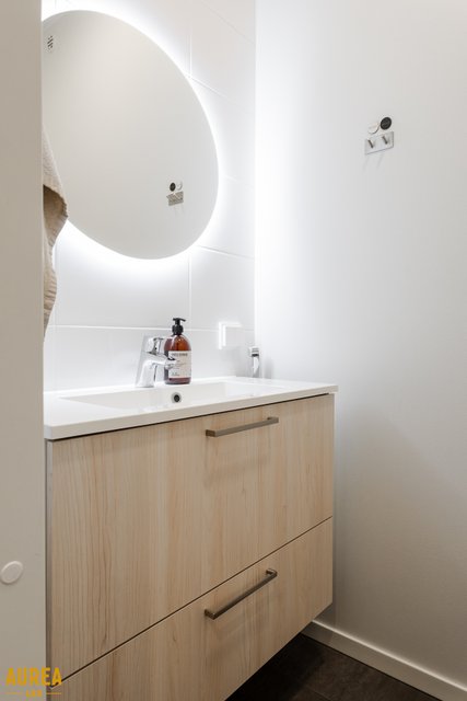 - Erillinen wc. Kaunis puunsävyinen kalustus, valopeili.