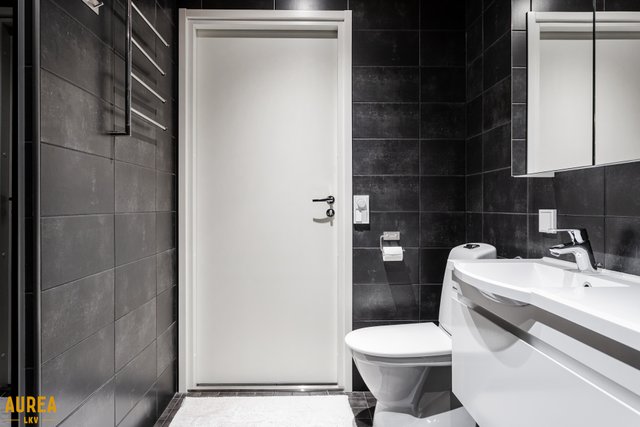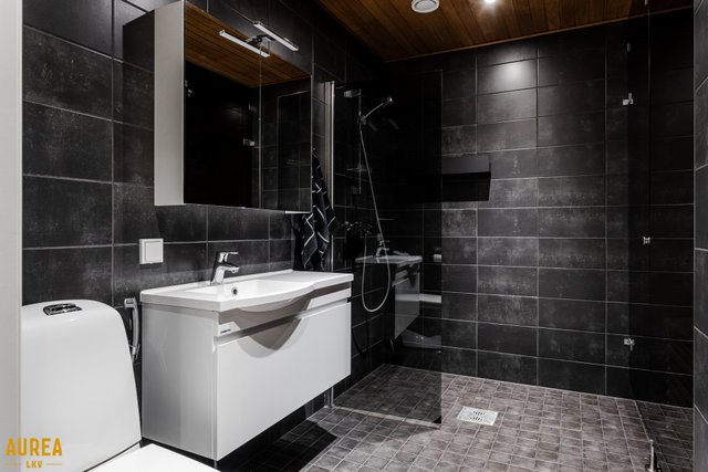 - Erillinen tilava kylpyhuone. Tummat tyylikkäät laatat.