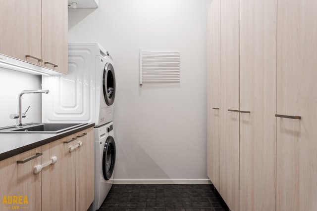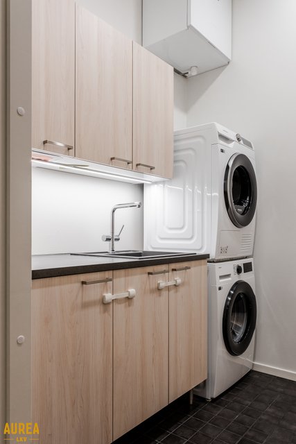- Erillinen kodinhoitohuone jossa kiintokalustus sekä liitännät pyykinpesukoneelle/kuivausrummulle.