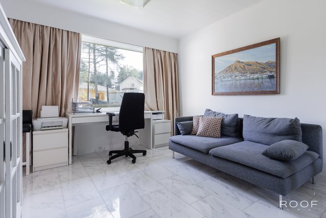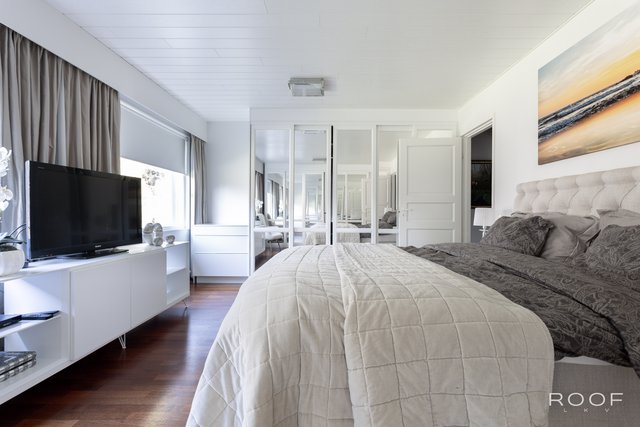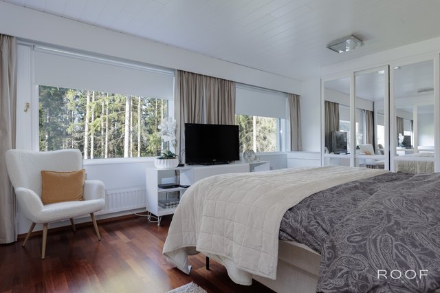 - Talossa on nykyisellään neljä makuuhuonetta, mutta tarvittaessa saat helposti yhden lisää. Päämakuuhuone on suuri ja jaettavissa kahteen huoneeseen. Kaikissa huoneissa on vaatekaapistot. Lattiat ovat parkettia ja seinät maalattu.