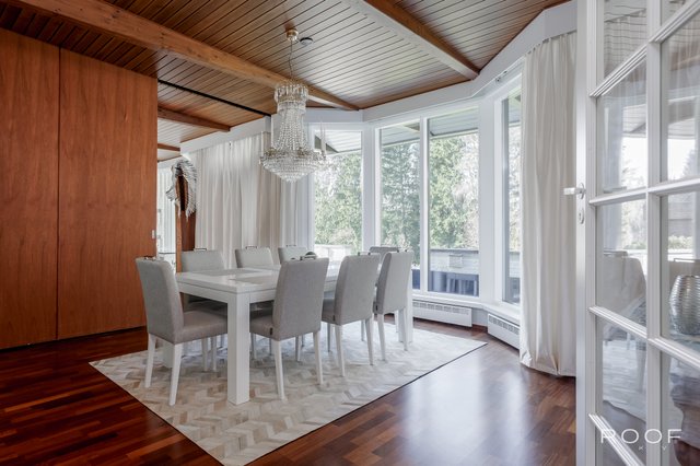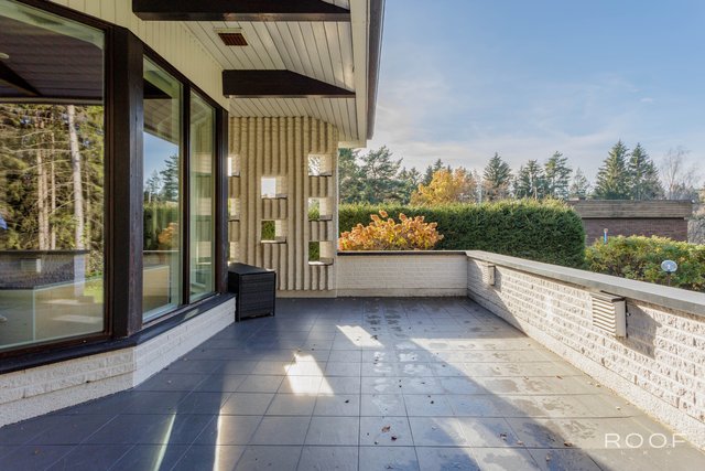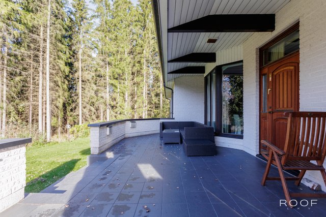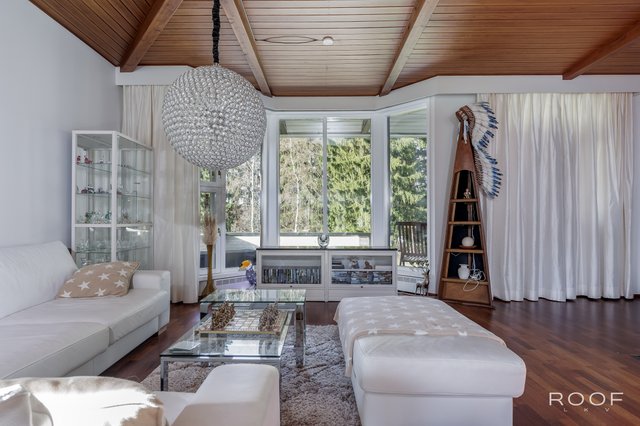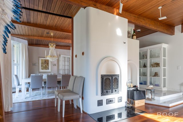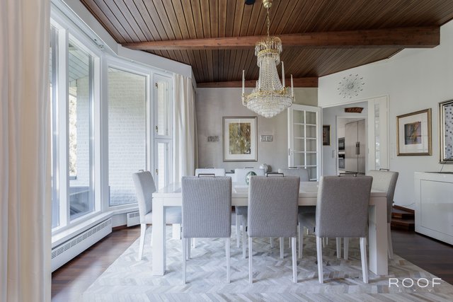 - Eteinen on tilava ja sen yhteydessä on peililiukuovikaapisto. Eteisessä on upeat kattopalkit ja marmorilaatat. Ruokailutila on suuri ja siitä on kauniit näkymät erkkeri-ikkunoiden kautta metsään. Talon yhteydessä on suuri kahden auton lämmin autotalli.