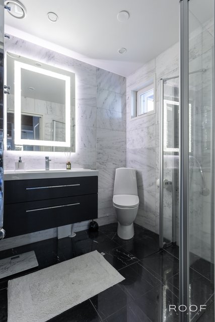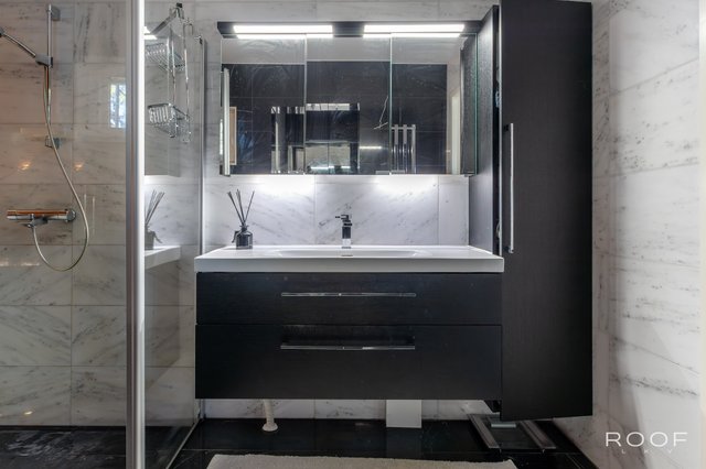 - Upea pääkylpyhuone on uusittu vuonna 2016. Varustus: suihku, suihkuseinä, leveä peilikaappi, leveä allaskaapisto, kaapisto, kuivauspatteri. Koko tila marmorilaattaa. Kylpyhuoneen yhteydessä on erillinen wc. Talon toinen kylpyhuone on uusittu vuonna 2016. Varustus: suihku, kääntyvät suihkuseinät, wc-istuin, kuivauspatteri, valopeili, allaskaapisto. Koko tila on marmorilaattaa.