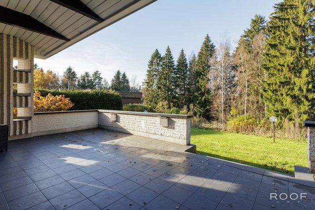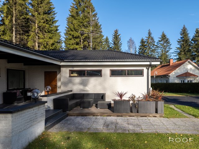 - Talon etu-ja takapuolella on suuret laattapintaiset terassit. Talon etupuolella on myös puinen terassi.