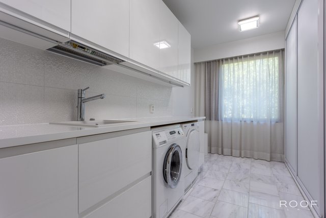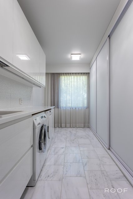 - Tilava kodinhoitotila, jossa on paljon säilytystilaa. Varustus: allas ja hana, pesukoneliitäntä, työtaso, kaapistot. Liukuovien takana runsaasti säilytystilaa. Lattia marmorilaattaa ja seinät maalattu.