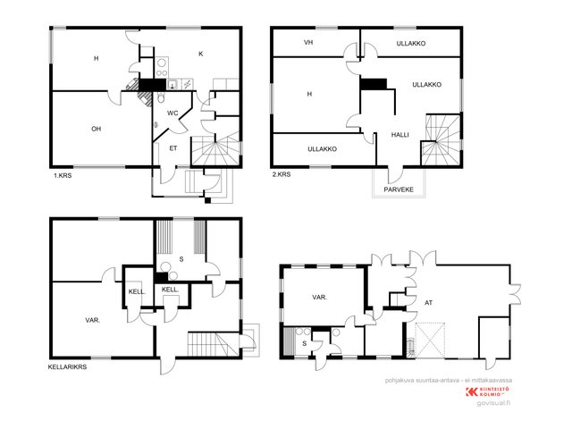 2H+K+WC/ suihku+eteinen, 2krs huone / ullakkotila, kellarikrs. S+PH+Varasto koppeja.