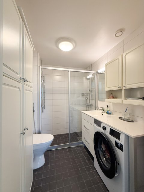 - WC-istuin, suihku, pesukoneliitäntä, bidee-suihku, allaskaappi, pesuallas, suihkuseinä, ja kaapistot