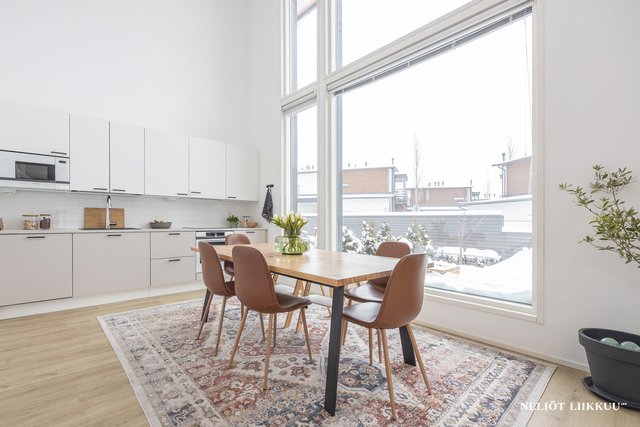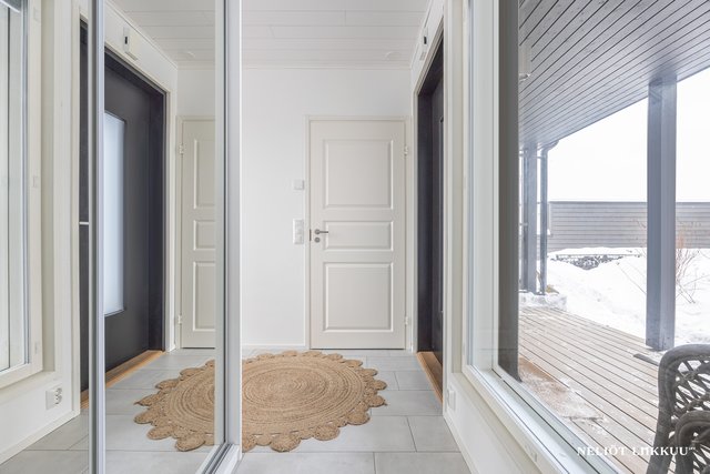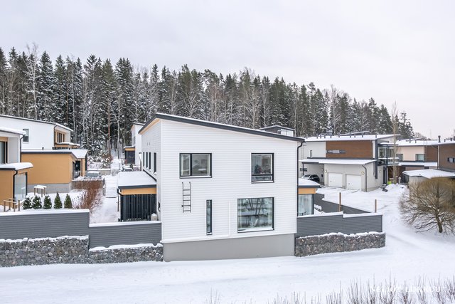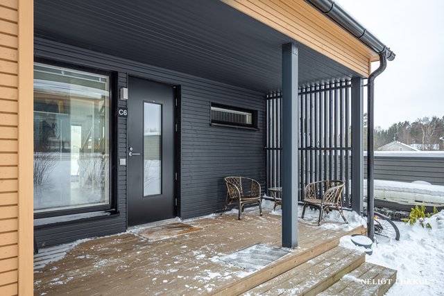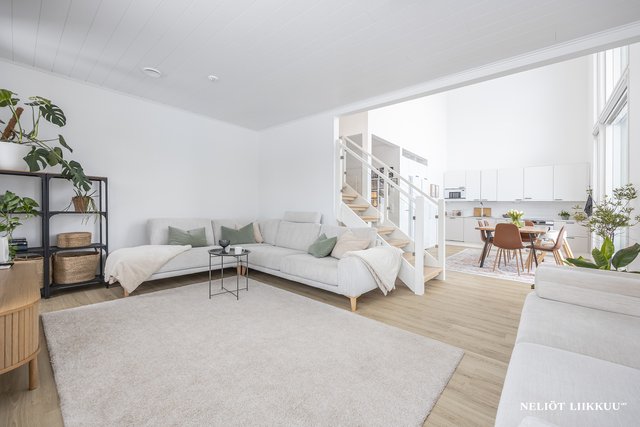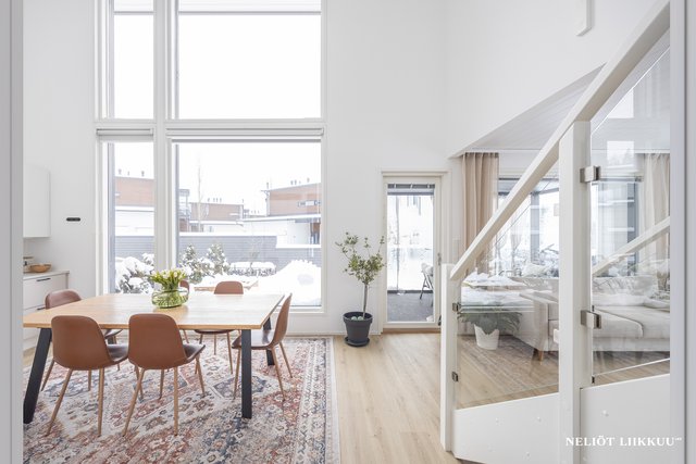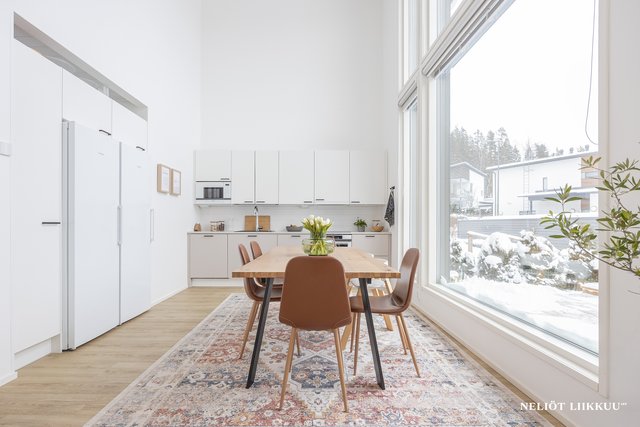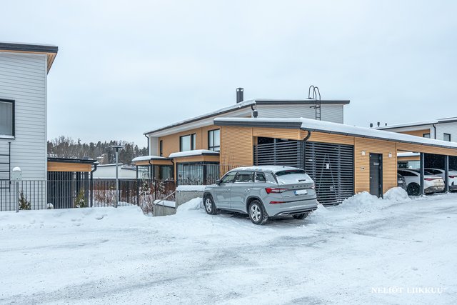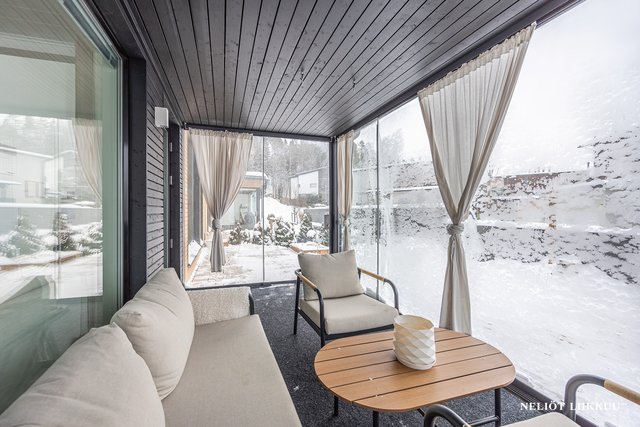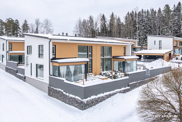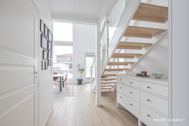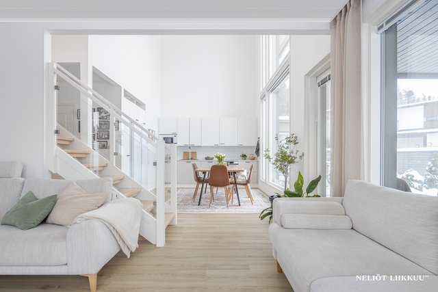 Tämä kaunis valoisa paritaloasunto suositussa Espoon Saunalahdessa on rakennettu v. 2022. Asunnossa on loistava pohja. Keittiö ja ruokailu on avointa korkeaa tilaa, jonne tulvii valoa korkeista upeista ikkunoista. Olohuoneesta, jonne merikin pilkistää, on käynti tilavalle lasitetulle terassille, josta pääsee myös avoterassille ja nurmikolle, jonne aurinko paistaa ihanasti lähes koko päivän. Lapsi- ja koiraperheen arkea helpottaa heti sisääntulon vieressä oleva tilava kodinhoitohuone, jonne saa kätevästi vaatteet heti kuivumaan. Terassit ovat molemmin puolin huoneistoa ja etuterassin yhteydessä on lämmin tilava ulkovarasto.