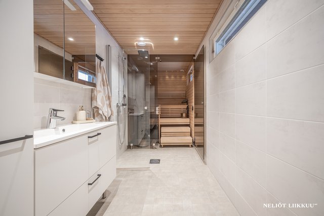 - Saunan yhteydessä oleva kylpyhuone Varustus: suihku, suihkuseinä, peilikaappi, allas ja allaslaatikosto sekä kaappi. Yläkerran kylpyhuone Varustus: suihku, suihkuseinä, peilikaappi, allas ja allaslaatikosto, wc-istuin, bidee-suihku.