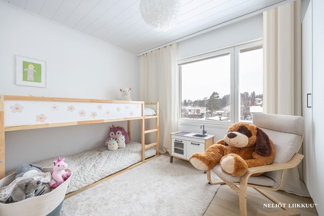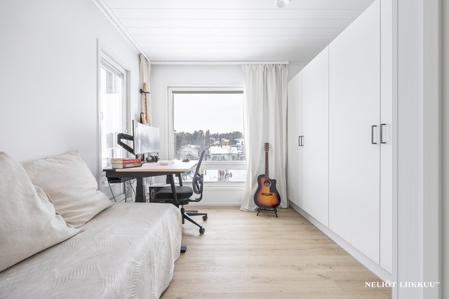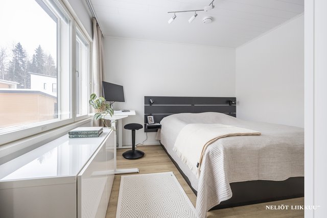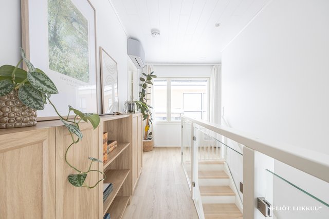 Yläkerrassa on kolme makuu- / työhuonetta, joissa jokaisessa on kiinteät kaapistot. Yläkerrassa on alakerran upean saunaosaston lisäksi toinen asunnon kylpyhuoneista. Asunto on energiatehokas ja muuttovalmis ja tarjoaa modernia asumista perheelle, joka arvostaa tilaa ja valoa. Tässä on erinomainen valinta pitkäaikaiseen asumiseen. Asumiskulut ovat edulliset, hoitovastike on vain 509,93 euroa kuukaudessa (4,70 eur eur / m2).