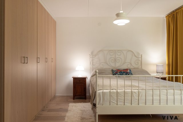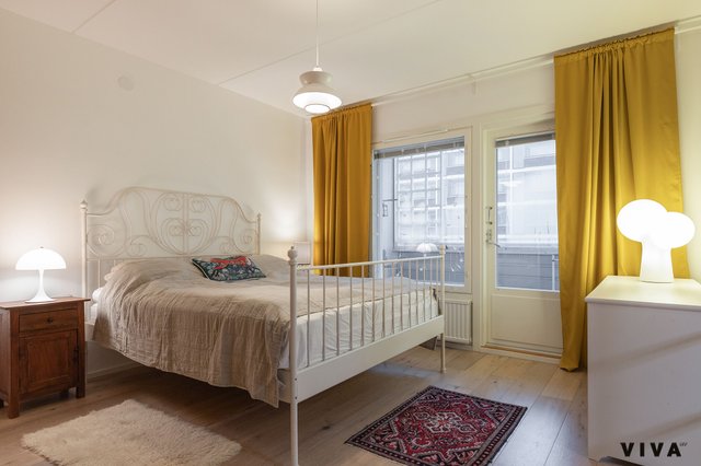 Makuuhuone on poikkeuksellisen suuri, ja sieltä löytyy runsaasti kaappitilaa. Makuuhuoneesta on käynti lasitetulle parvekkeelle, joka suuntautuu rauhalliselle sisäpihalle – täydellinen paikka nauttia aamukahvista tai ilta-auringosta.