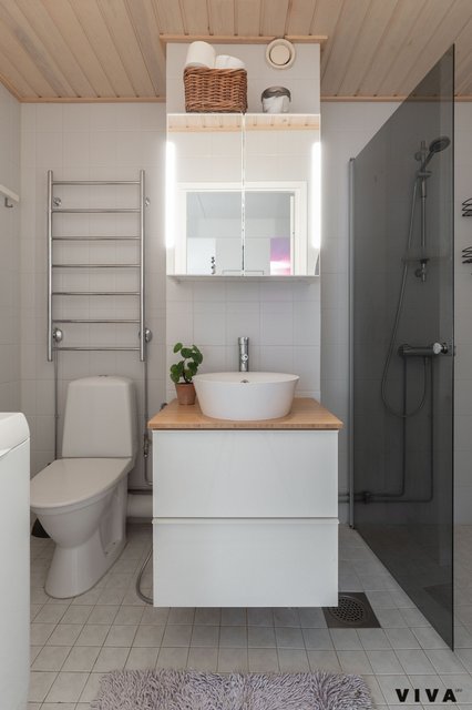 - WC-istuin, suihku, suihkuseinä, pesukoneliitäntä, peilikaappi, pesuallas, ja bidee-suihku
