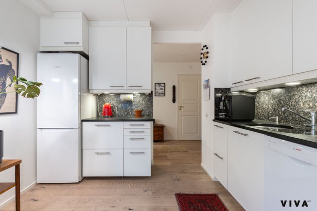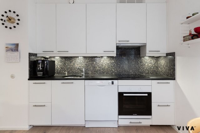 Keittiö on reilun kokoinen ja sinne mahtuu helposti ruokailuryhmä – täydellinen paikka yhteisille aterioille ja arkiselle oleskelulle.